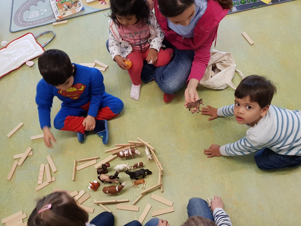 Zusätzlich erfolgt die Sprachförderung ganz natürlich während des Spielens – hier zB zum Thema Tiere, Zoo und Bauernhof.